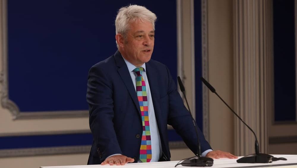 Der ehemalige Parlamentspräsident des Vereinigten Königreichs, John Bercow, hält am 10. April 2026 eine Ansprache auf einer internationalen Konferenz zur Hinrichtung politischer Gefangener
