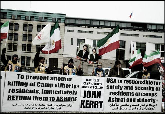 Anlässlich des Besuches von US Außenminister John Kerry am Dienstag in Berlin sammelten sich Deutsch-Iranische Bürger vor der amerikanischen Botschaft. Sie fordern die US-Regierung auf sofortige Maßnahmen im Irak zu ergreifen um ein erneutes Massaker in Camp Liberty zu verhindern. Das Camp war am 9. Februar Ziel eines blutigen Raketenangriffs mit 7 Todespofern und 100 zum Teil schwer Verletzten.
