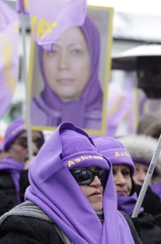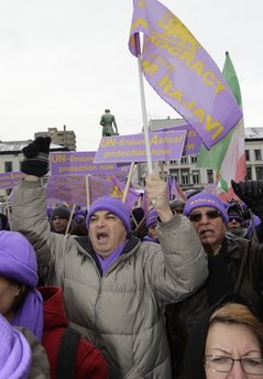 Demonstranten versammelten sich am 1. Dezember 2010 vor dem EU Parlamentsgebäude in Brüssel. Exiliraner aus verschiedenen Ländern fordern die UN auf, eine Resolution des EU Parlamenten umzusetzen und Maßnahmen zum Schutz der Bewohner von Ashraf einzuleiten, wo 3400 Mitglieder der iranischen Opposition im Irak leben. Das Bild oben rechts zeigt Maryam Rajavi, die Anführerin der iranischen Opposition.