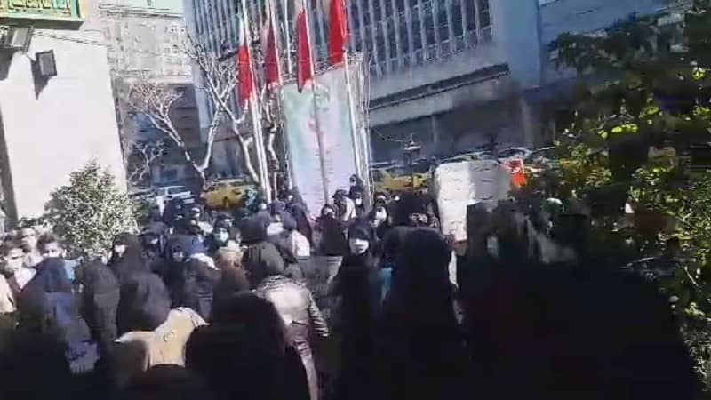 Vertragsunternehmer von Iran Mall halten eine Kundgebung vor dem Zentralgebäude der Ayandeh Bank in Teheran ab