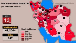 Die Organisation der Volksmudschahedin des Iran (PMOI/MEK) hat am 13. Mai 2020 bekannt gegeben, dass die Zahl der Todesfälle im Iran in 317 Städten die Zahl 41 200 überschritten hat. Die Zahl der Opfer in Teheran beträgt 6 885, in Mazandaran 2 535, in Isfahan 2 490, in Khusistan 2 360, in Ost-Aserbeidschan 1465, in Hamedan 1165, in Sistan und Belutschistan 1110, in Luristan 1105 und in Chaharmahal und Bakhtiari 350.