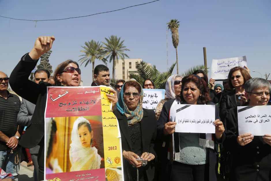 Eine Gruppe von irakischen Frauen hat in Bagdad gegen einen vom irakischen Kabinett gebilligten Gesetzentwurf protestiert, nach dem die Verheiratung von neunjährigen Mädchen zugelassen werden soll.