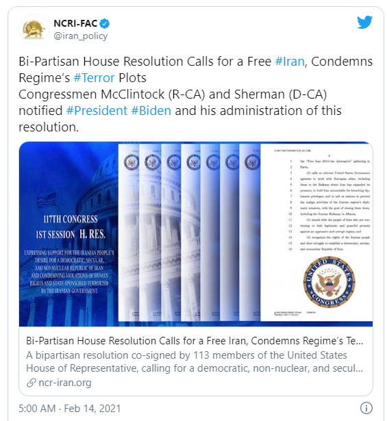 Kurz nachdem die neue Administration in den Vereinigten Staaten an die Macht gekommen ist, haben 113 Mitglieder beider Parteien im US Repräsentantenhaus eine gemeinsame Resolution eingebracht, in der der staatlich geförderte Terrorismus des Regimes und die systematischen Verletzungen der Menschenrechte verurteilt werden und ein demokratischer Iran unterstützt wird, wie er im Zehn Punkte Plan dargestellt wird, der von Frau Maryam Rajavi, der gewählten Präsidentin der Opposition, präsentiert wurde. Die Resolution ruft die US Regierung auf, eine entschiedene Haltung gegen das Atomprogramm des Regimes und die Erpressungskampagne einzunehmen.