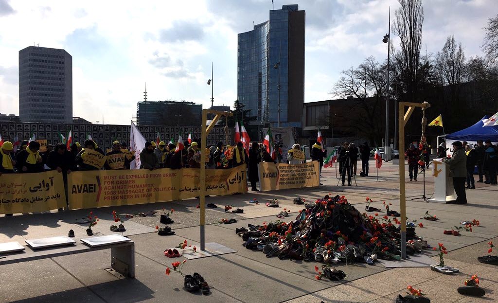 Auf einem der Transparente war zu lesen: „Avaei sollte der Prozess vor dem internationalen Strafgerichtshof gemacht werden wegen seiner Rolle bei dem Massaker an politischen Gefangenen im Iran im Jahr 1988“. „Avaei muss aus dem UN Menschenrechtsrat wegen der Verbrechen gegen die Menschlichkeit ausgeschlossen werden“, so ein anderes Transparent, das die Protestierenden in die Höhe hielten.