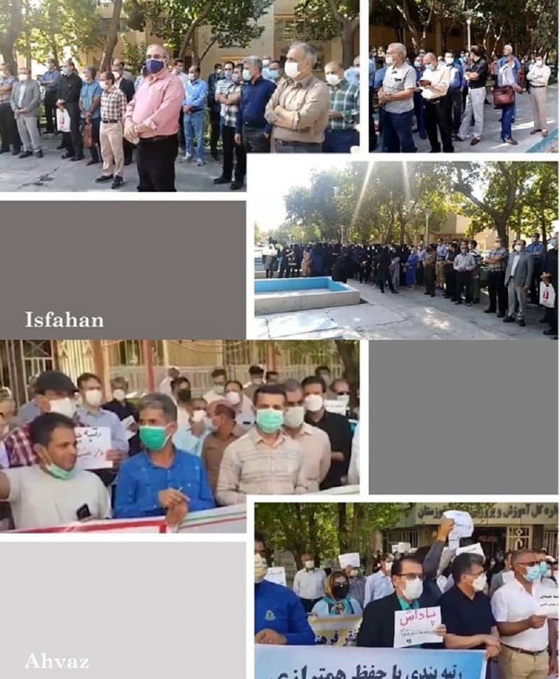 Am Morgen des Samstag, des 18. September, haben Lehrer in Teheran und in vielen anderen Städten, darunter Isfahan, Karadsch, Schiraz, Ahwaz, Täbriz, Ghom, Ilam, Ardabil, Yasudsch, Khorramabad, Bandar Abbas, Shahrekord und Dehdasht, gegen die fehlende Umsetzung des Einstufungsplans, die Nichtzahlung der Rentenzuschüsse und ihre elenden Arbeits- und Lebensbedingungen protestiert.