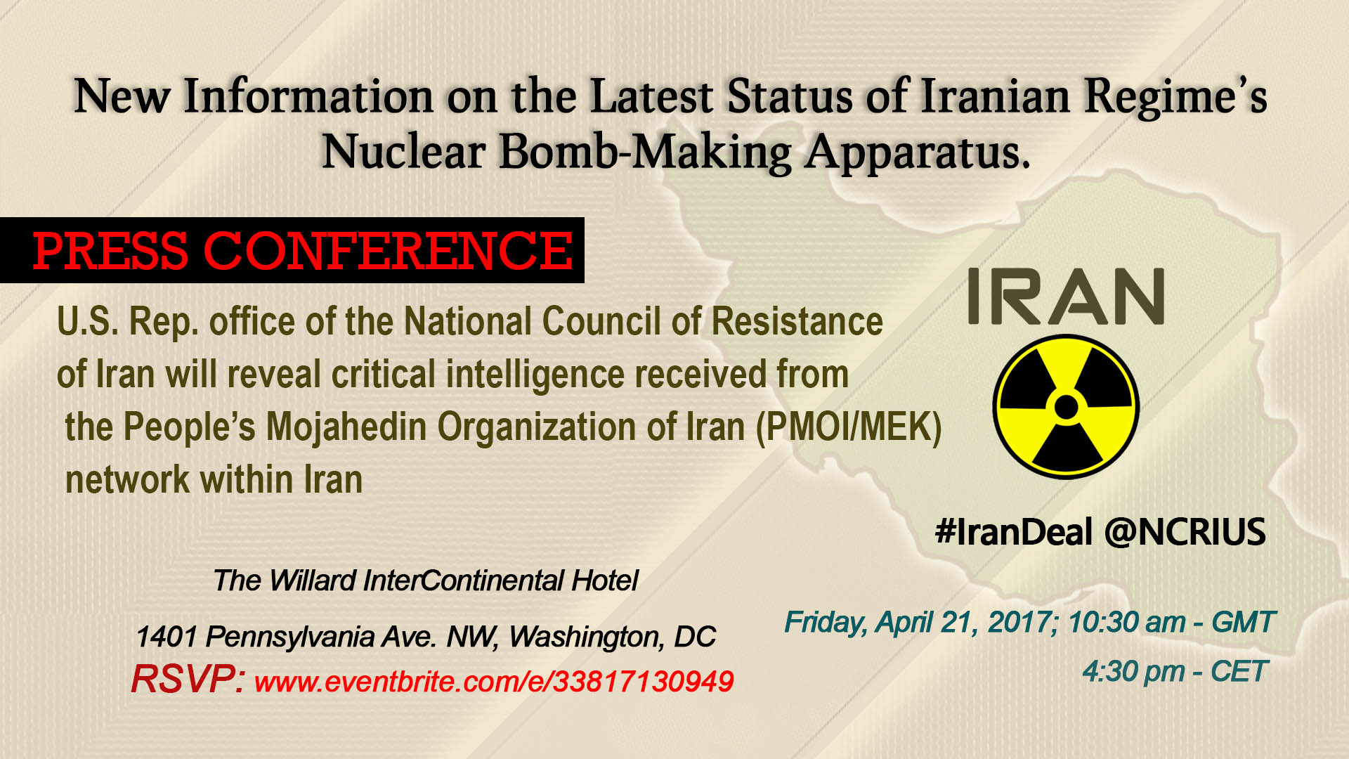 Die US – Vertretung des Nationalen Widerstandsrates Iran (NWRI – US) wird am 21. April 2017 um 10:30 Uhr Ortszeit im Williard Room im Willard InterContinental Hotel (1401 Pennsylvania Ave NW, Washington, DC) eine Pressekonferenz dazu abhalten, in der Details über Orte, Satellitenbilder und beteiligte Personen veröffentlicht werden.