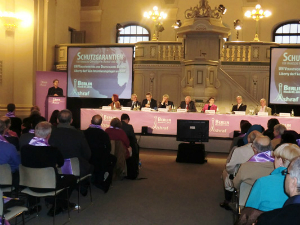 Um auf die Not dieser Menschen aufmerksam zu machen, hat das Deutsche Solidaritätskomitee für einen freien Iran (DSFI) anlässlich des diesjährigen Frauentages die Konferenz für Solidarität mit 1.000 Frauen in Camp Ashraf am 7. März in Berlin organisiert. Der Ort für die Veranstaltung konnte nicht treffender gewählt werden: Zahlreiche Gäste fanden sich in der 1705 gebauten Französischen Friedrichstadt Kirche ein, der Kirche die ursprünglich für Glaubensflüchtlinge aus Frankreich gebaut wurde. Zum vermehrten Male sprachen sich die langjährige Bundestagspräsidentin Frau Professor Rita Süssmuth, der ehemalige Vizepräsident der Europäischen Kommission Günter Verheugen sowie Klaus Bresser, der ehem. Chefredakteur vom ZDF und Otto Bernhard, DSFI Vorsitzender sowie Gerhart Baum, ehemaliger Bundesminister, Jürgen Chrobog, ehemaliger Botschafter in den USA sowie Greta Tüllmann, Herausgeberin der Zeitschrift “ab40” für die Solidarität mit den Menschen in Ashraf aus. Wie alle anderen anwesenden Exil-Iraner und deren Unterstützer werden sie nicht müde sich für die Menschen in Ashraf einzusetzen.