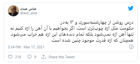 „Die klare Lektion von Chaharshanbe Suri ist: Es (das Regime) ist wie eine Holzsäge. Wenn wir damit Metall sägen wollen, dann werden wir nicht nur nicht in der Lage sein, Metall zu schneiden, sondern auch die Holzsäge wird dabei beschädigt. All die Sägeblätter der Holzsäge werden irgendwann beschädigt sein. Und genauso ist das mit der Macht“, schrieb Abdi am 17. März auf Twitter.