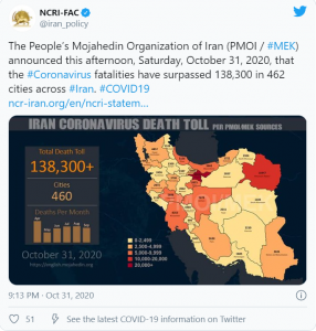 Der Kommandeur der Revolutionsgarden (IRGC), Hossain Salami, gab eine neue Entscheidung bekannt. Nun sollen „Häuser durchsucht werden, um kranke Personen zu finden“ und „infizierte Personen von anderen separiert und in Gesundheitszentren gebracht werden“.(Staatliche Webseite Khabar – Online, 31. Oktober).