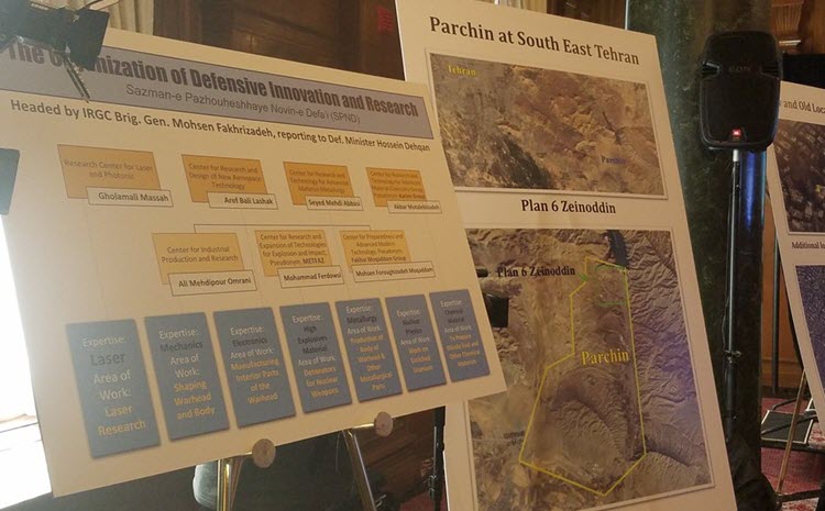 Die MEK legte Satellitenfotos und genaue Beschreibungen der Anlagen der Nuklearforschung im Komplex Parchin vor. Dazu gehört „Plan 6“, gelegen „am Ende der sog. „Babai“-Autobahn nach Babaj und an der Militärstraße Khojir-Parchin, nach dem Tunnel an der Südseite des Staudamms von Mamlo“. Die Anlage wird bewacht von der Islamischen Revolutionsgarden, der wichtigsten Sicherheitskraft des Iran.
