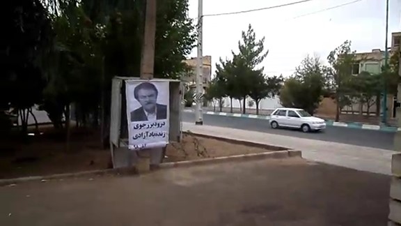 Widerstandseinheit Nr. 198: Ein Poster von Massoud Rajavi, dem historischen Leiter der MEK an einem öffentlichen Platz in Kashan (Zentral-Iran). Der Text: „Es lebe Rajavi, es lebe die Freiheit!“