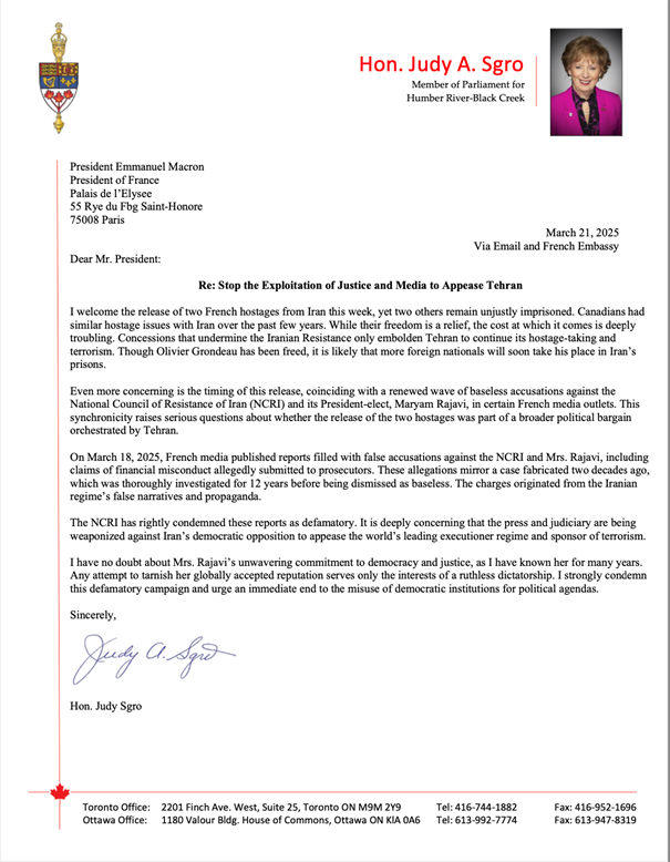 In einem scharf formulierten Brief an den französischen Präsidenten Emmanuel Macron verurteilte die kanadische Parlamentsabgeordnete Judy A. Sgro die „Inszenierung von Justiz und Medien “, um das iranische Regime zu beschwichtigen. Sie begrüßte zwar die kürzlich erfolgte Freilassung zweier französischer Geiseln aus dem Iran, warnte aber, dass solche Zugeständnisse – insbesondere im Zusammenhang mit diffamierenden Angriffen auf den Nationalen Widerstandsrat Iran (NWRI) und seine gewählte Präsidentin Maryam Rajavi – Teherans anhaltende Strategie der Geiseldiplomatie und Repression nur bestärken.
