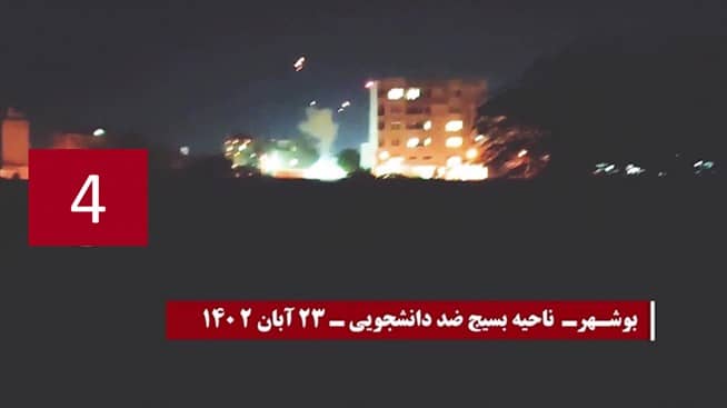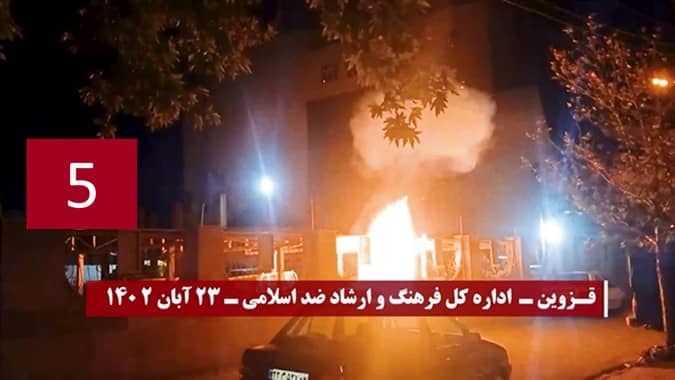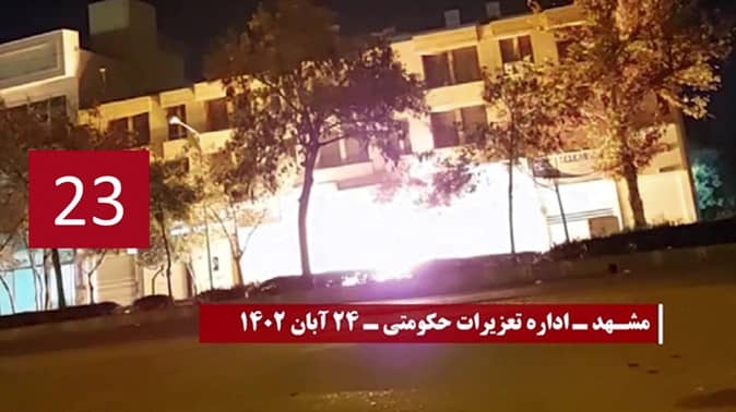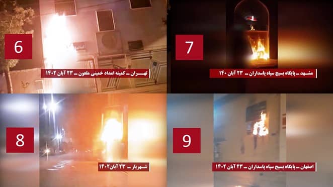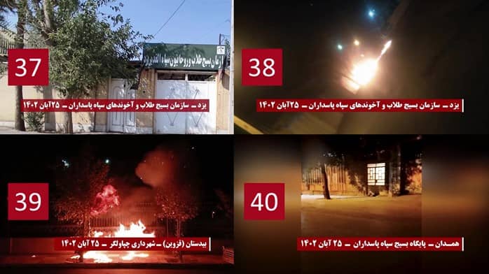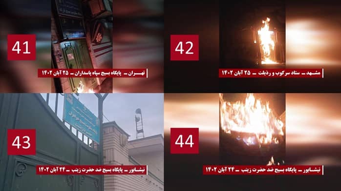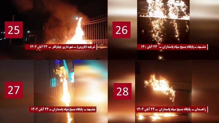 Zahllose Basidsch Basen und Zentren der Unterdrückung durch das Regime, der Spionage und Ausplünderung wurden mit Brandsätzen angegriffen, so dass Gebäude, Embleme und Eingänge dieser Einrichtungen abbrannten, Außerdem wurden Dutzende von Schrifttafeln, Transparente und Poster, die Khomeini, Khamenei, Raisi und Qasem Soleimani zeigten, in verschiedenen Städten angezündet.