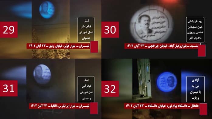 Die Widerstandseinheiten projizierten Bilder von den Führern des Widerstands, Herrn Masoud Rajavi und Frau Maryam Rajavi an hohe Gebäude. Sie brachten auch Schriftzüge an, die für den Sturz des Mullah Regimes und den Aufbau eines demokratischen Systems im Iran eintraten, und das an mehreren Stellen in Teheran und in anderen Städten, darunter Shiras, Maschhad, Rasht, Isfahan, Karadsch, Gorgan, Täbris, Zandschan, Urmia, Qazvin, Kermanshah, Semnan, Khalkhal, Miandoab, Shahr-e Kord, Takestan, Jonaqan, Mandschil, Kish, Shahriar, Dehdasht, Langroud, Pakdasht, Shahr-e Rey, Robat Karim, Babol, Shahroud, Kamyaran, Marivan und Iranshahr.