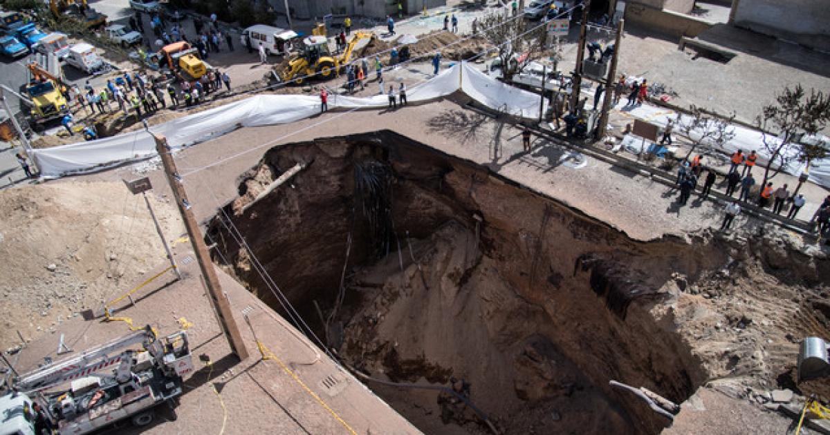 Rettungskräfte und schwere Maschinen sperren ein massives Erdloch ab, nachdem ein Teil einer städtischen Straße im Iran eingestürzt ist