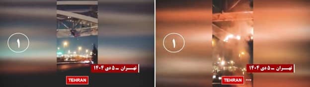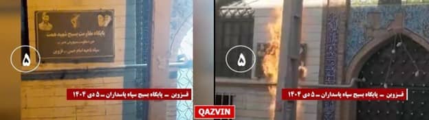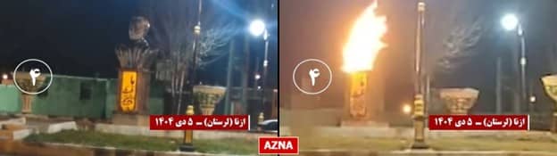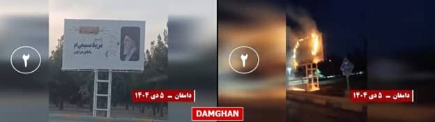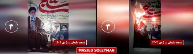 Darüber hinaus wurden in Isfahan, Maschhad, Yazd, Izeh, Teheran, Damghan, Masjed Soleimani, Azna, Aligudarz und Bandar Abbas Banner, Plakate und Bilder von Regimeführern, darunter Khomeini, Khamenei und Qasem Soleimani, in Brand gesteckt. Diese Aktionen, begleitet von Parolen wie „Tod Khamenei“ und „Tod dem Prinzip der Velayat-e Faqih“, stellten eine flammende Antwort auf die religiöse Diktatur und eine Erneuerung des Bündnisses mit den Märtyrern des Aufstands dar.
