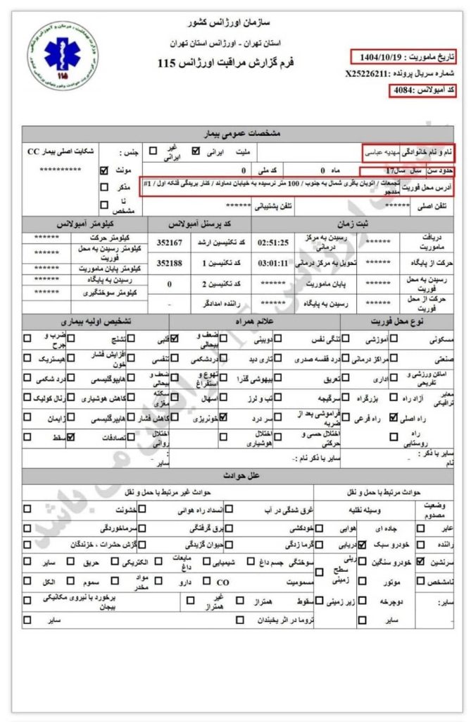 Adresse des Einsatzortes: Versammlungen an der Klinik, Gebiet der Resalat-Autobahn in Richtung Narmak / Ecke Nord-Majidieh / Farahbakhsh-Klinik