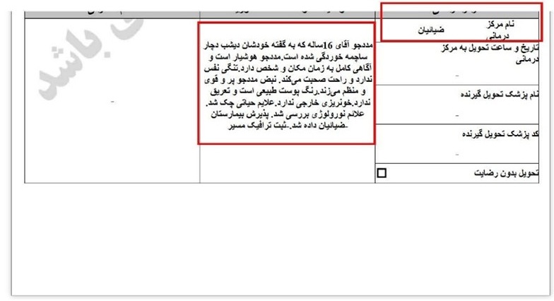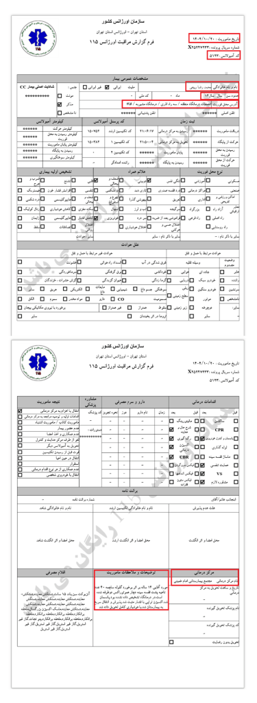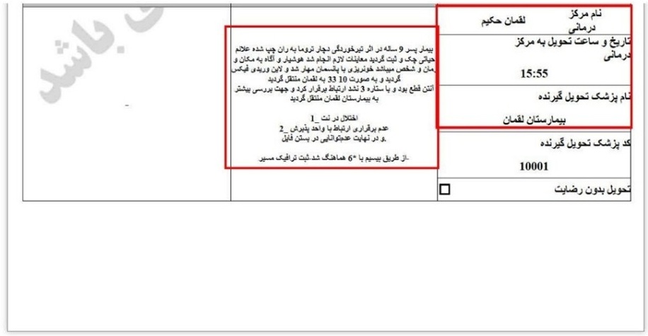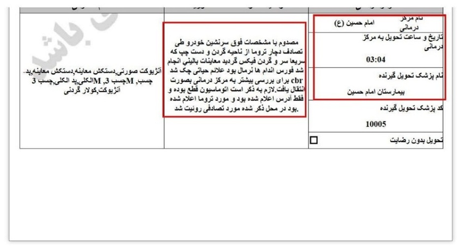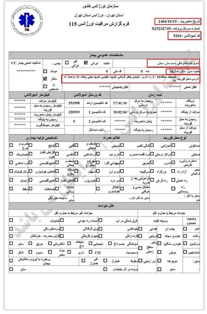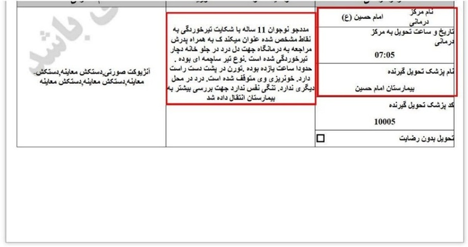 Die Blutung wurde durch einen Verband kontrolliert; der Patient wurde unter Code 3310 in das Loghman-Hakim-Krankenhaus überführt.
