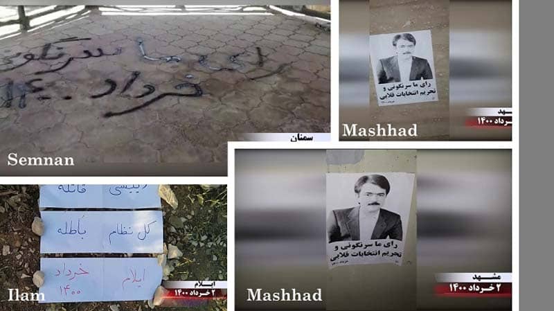 Maschhad, Semnan und Ilam – Aktivitäten der Widerstandseinheiten und Unterstützer der MEK, die zum Boykott der Scheinwahlen für die Präsidentschaft des Regimes aufrufen. Unsere Stimme ist die für den Regimewechsel – 23. Mai 2021