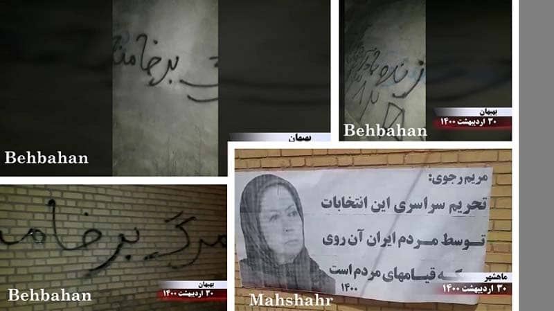 Behbahan und Mahshahr – Aktivitäten der Widerstandseinheiten und Unterstützer der MEK, die zum Boykott der Scheinwahlen für die Präsidentschaft des Regimes aufrufen. „Maryam Rajavi: Der landesweite Boykott dieser Wahl ist die Rückseite der Aufstände des Volkes“ – 20. Mai 2021