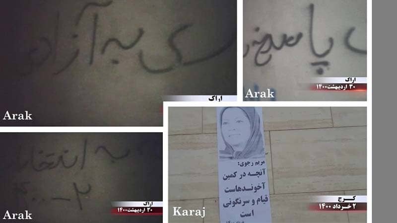 Karadsch und Arak – Aktivitäten der Widerstandseinheiten und Unterstützer der MEK, die zum Boykott der Scheinwahlen für die Präsidentschaft des Regimes aufrufen. „Maryam Rajavi: Die Mullahs erwartet ein Volksaufstand und er wird zu ihrem Sturz führen“ – 20. Mai 2021