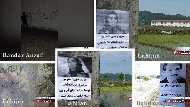 Lahijan und Bandar Anzali – Aktivitäten der Widerstandseinheiten und Unterstützer der MEK, die zum Boykott der Scheinwahlen für die Präsidentschaft des Regimes aufrufen. „Das ganze Regime ist mörderisch, die Wahlurne ist null und nichtig“. 20. bis 23. Mai 2021